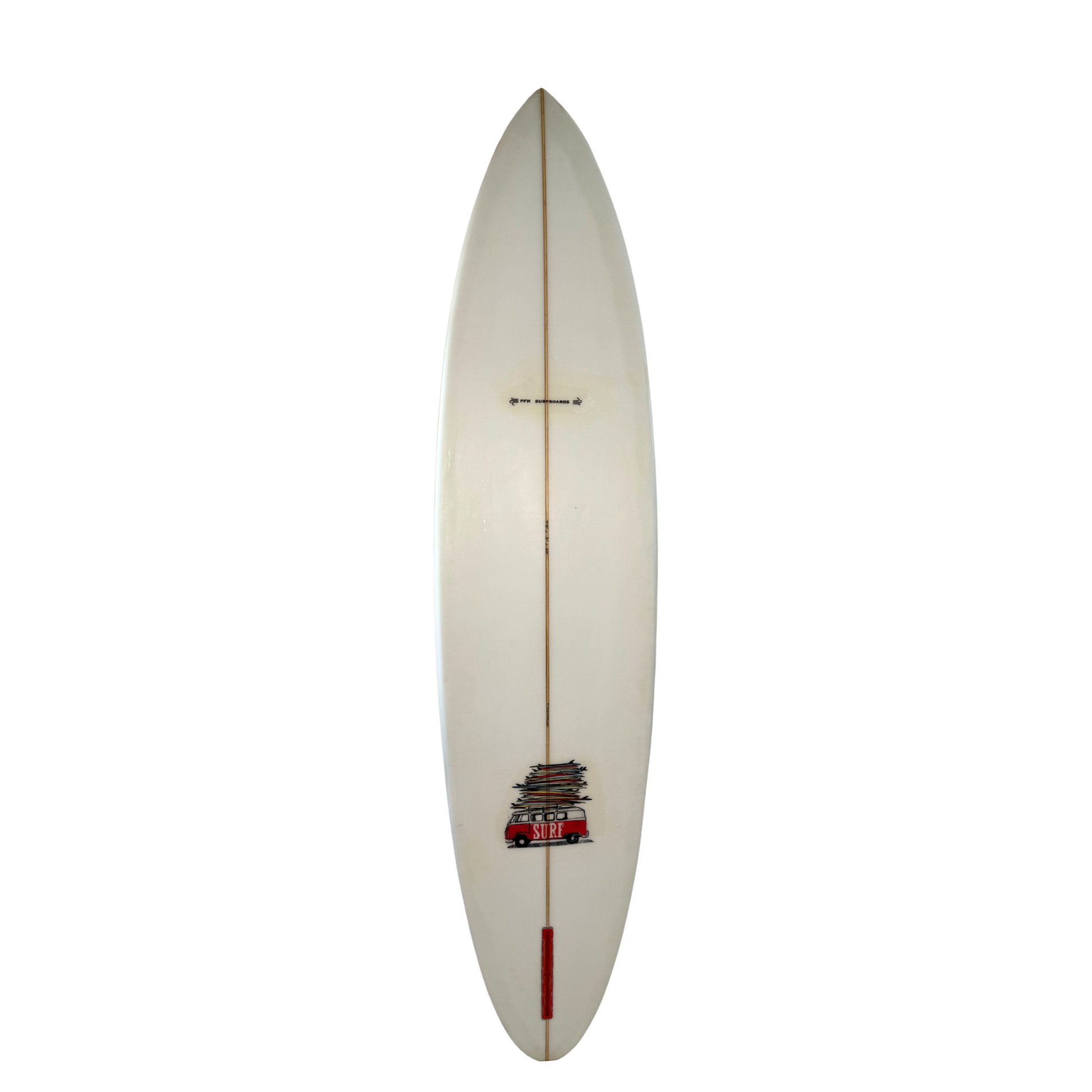 PCollectors Single Fin Fun Board, Hand-Shaped by Paul Manchoulas, Rainbow Stripped Deck + White Back