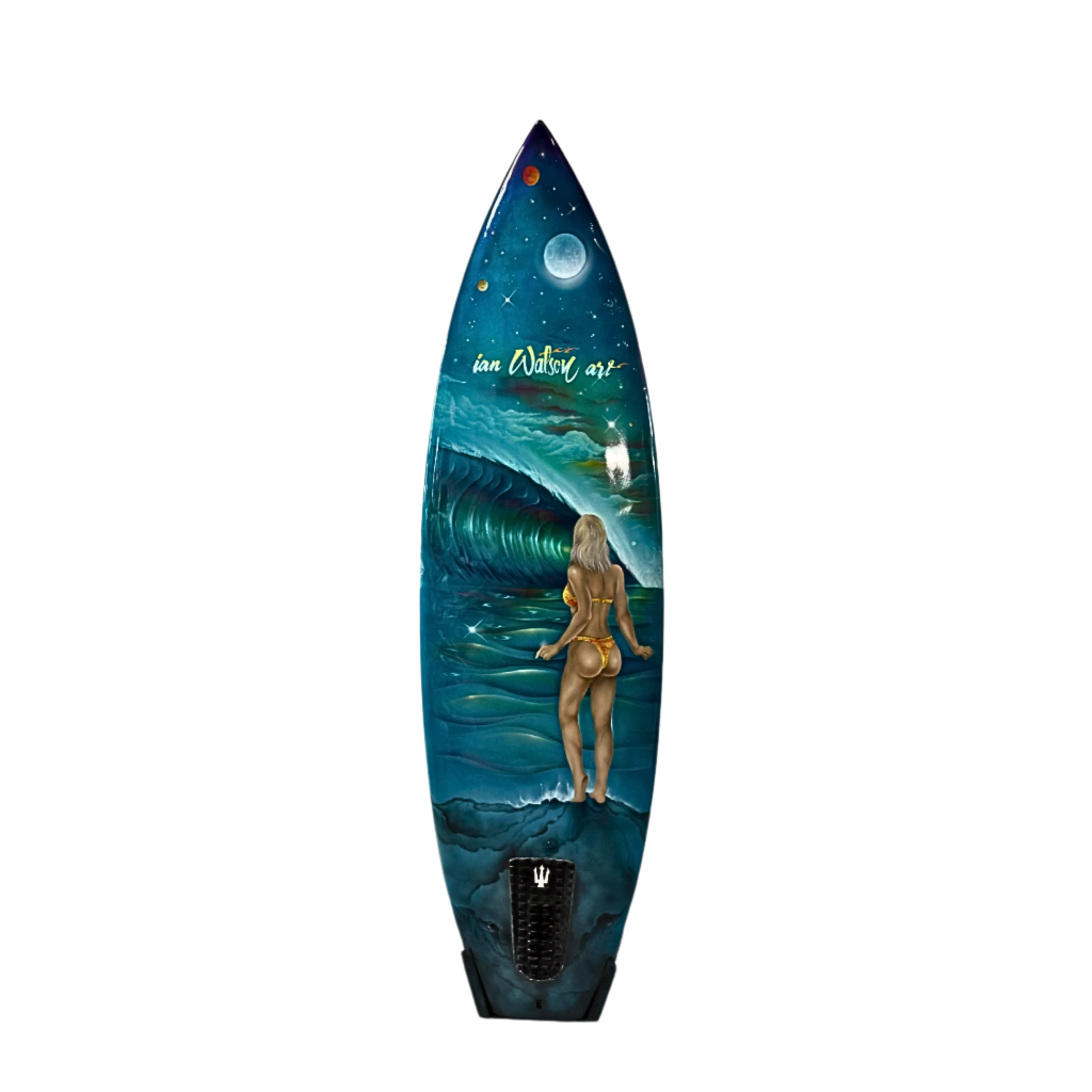 Exhibition only surfboard, artwork design by Ian Watson. Board had built in stand.